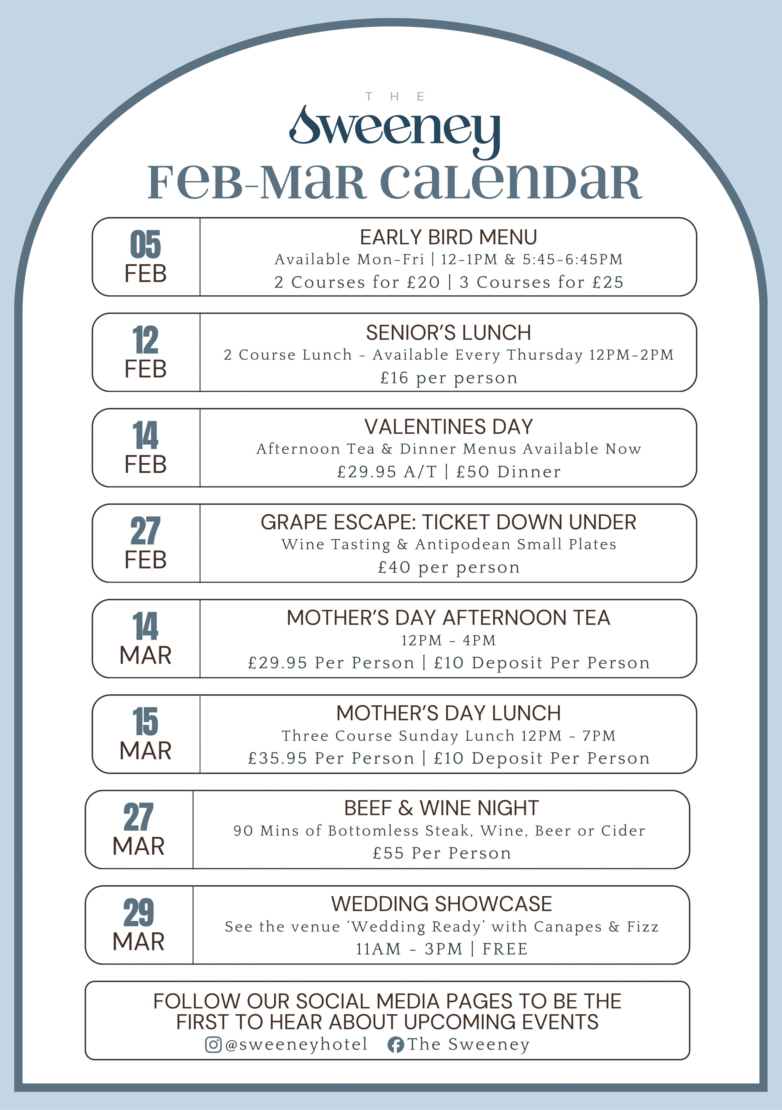 Explore what’s coming up at The Sweeney over February and March, from special dining experiences to seasonal events.